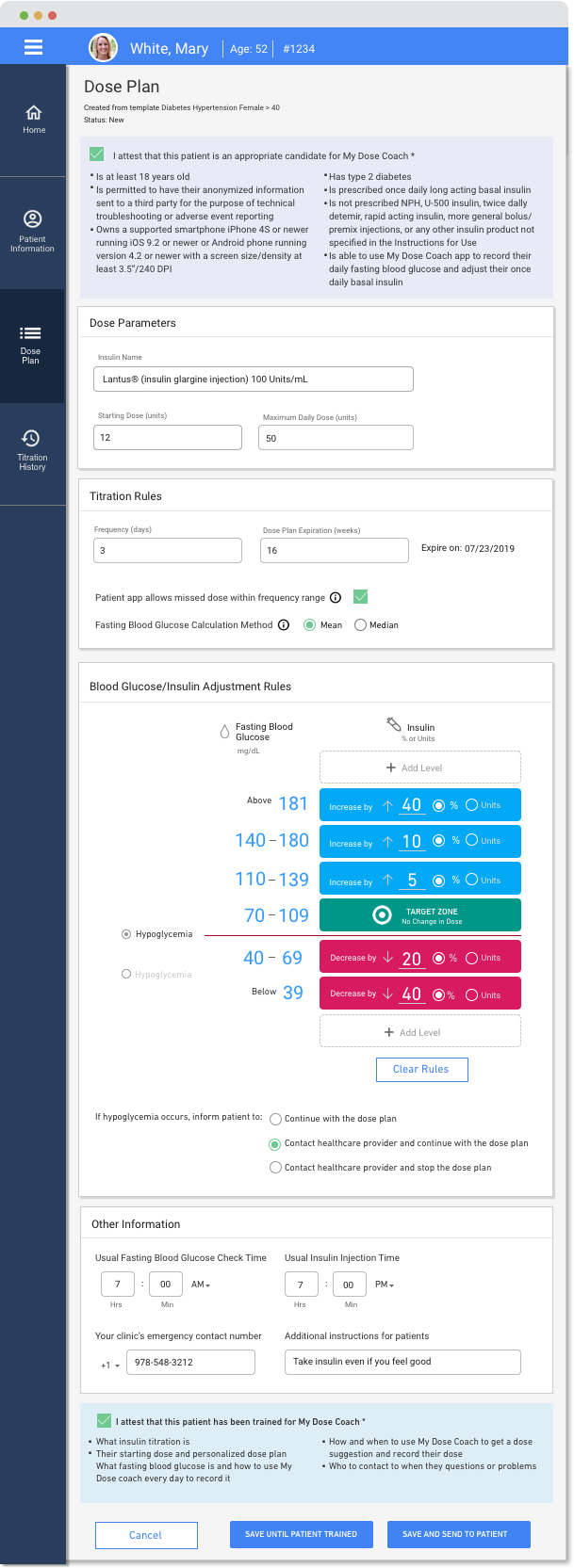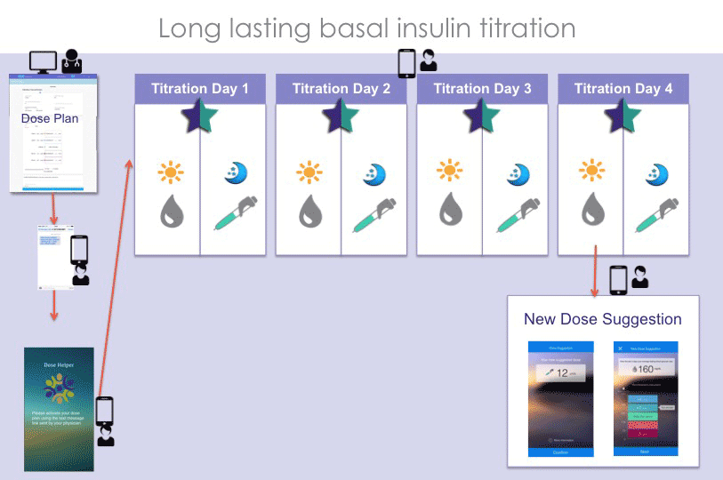 Objective: Design Digital Dosing Solution to replace the manual titration model that is typically used for dose modification of long-lasting insulin for Type 2 Diabetes patients. It provides: